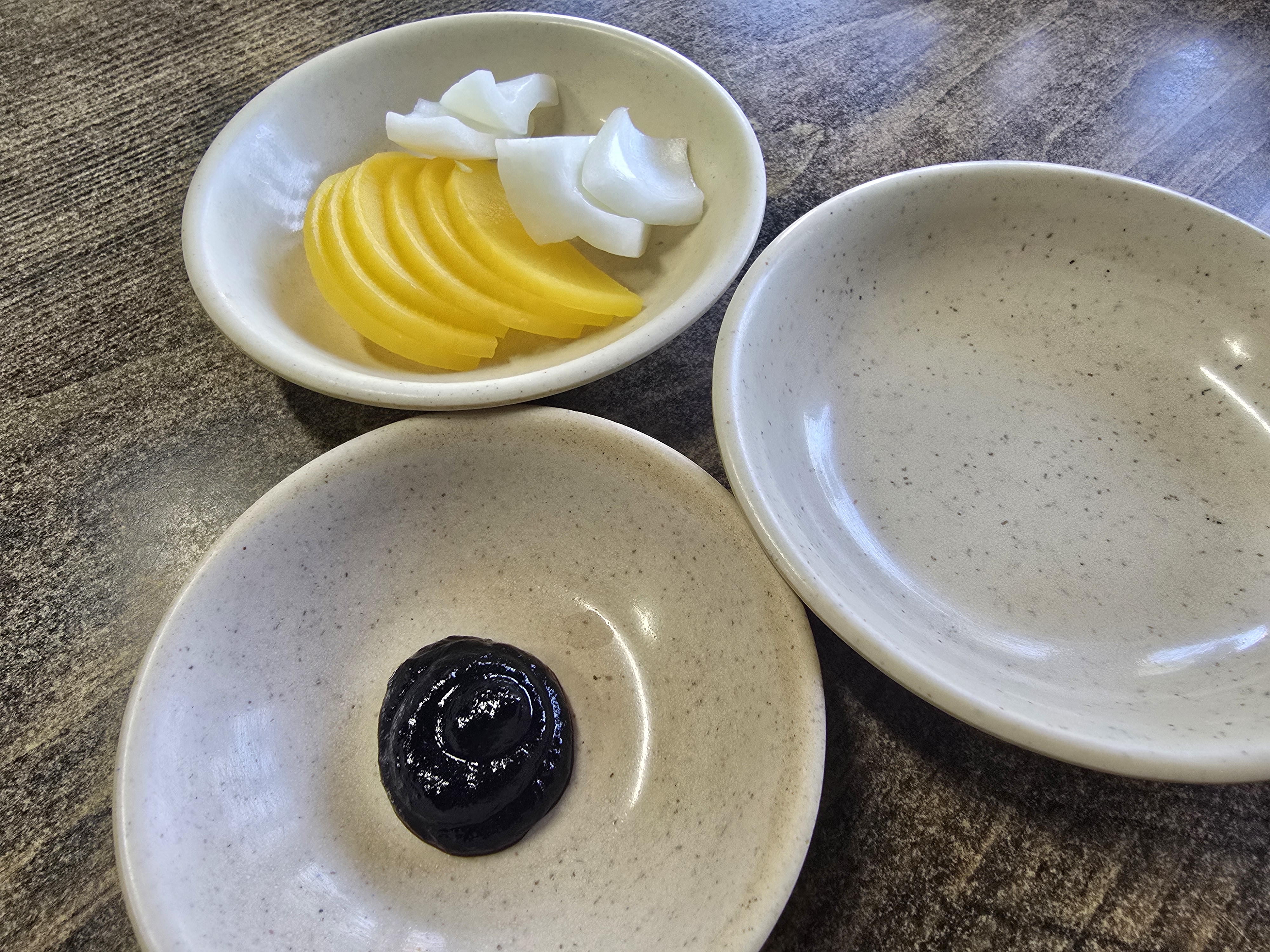 기본 반찬은 단무지와 양파가 나오구요.
