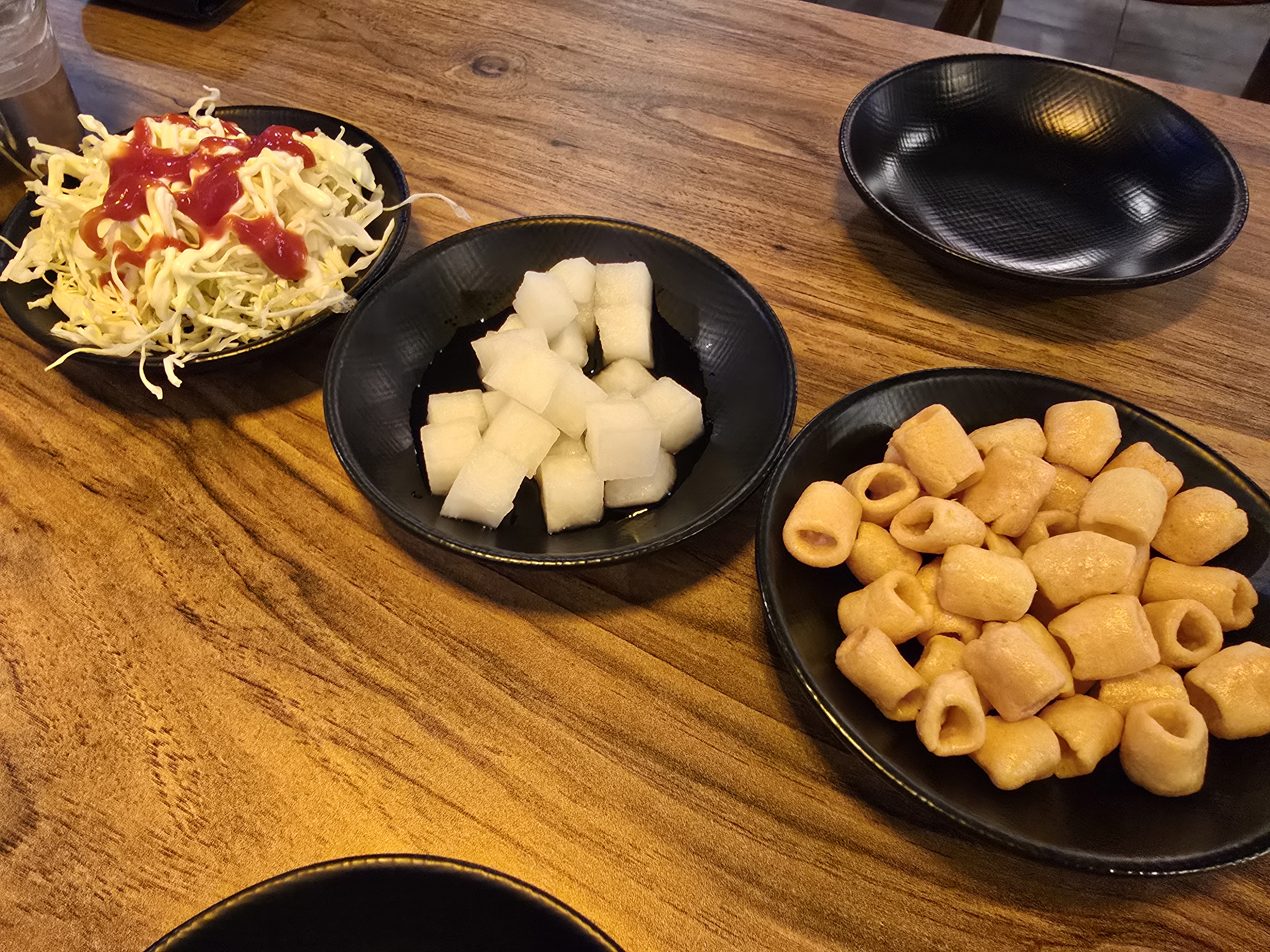 기본 셋팅으로 양배추샐러드, 치킨무, 마카로니 뻥튀기 주셨구요.