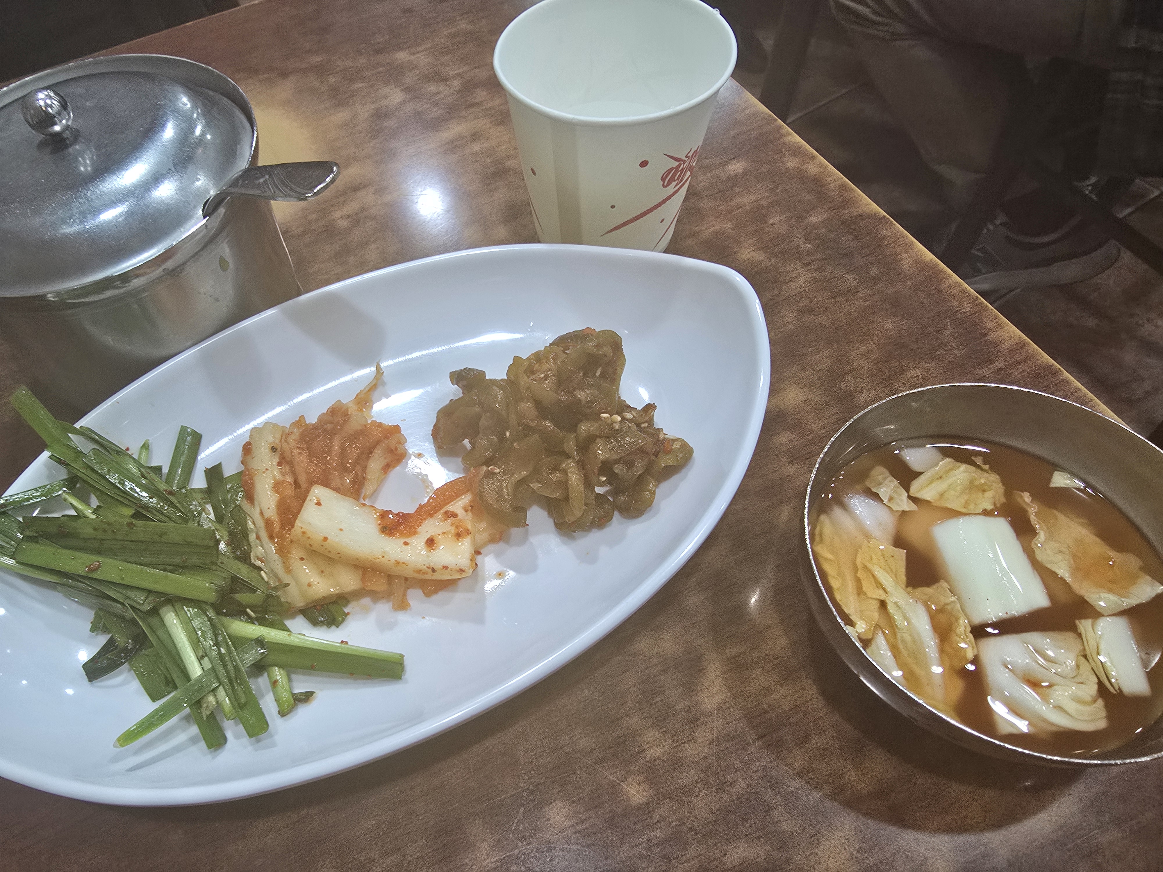 반찬은 부추, 김치, 오이장아찌가 있는데,